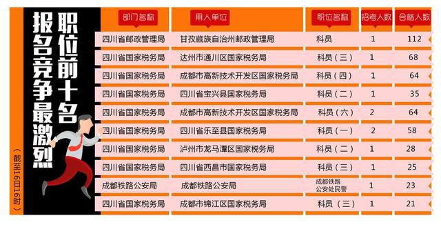 截至16日16時,競爭比例最高的職位是代碼為0601002001的“甘孜(微博)藏族自治州郵政管理局科員”一職,招錄1人,通過審核人數(shù)為112人。